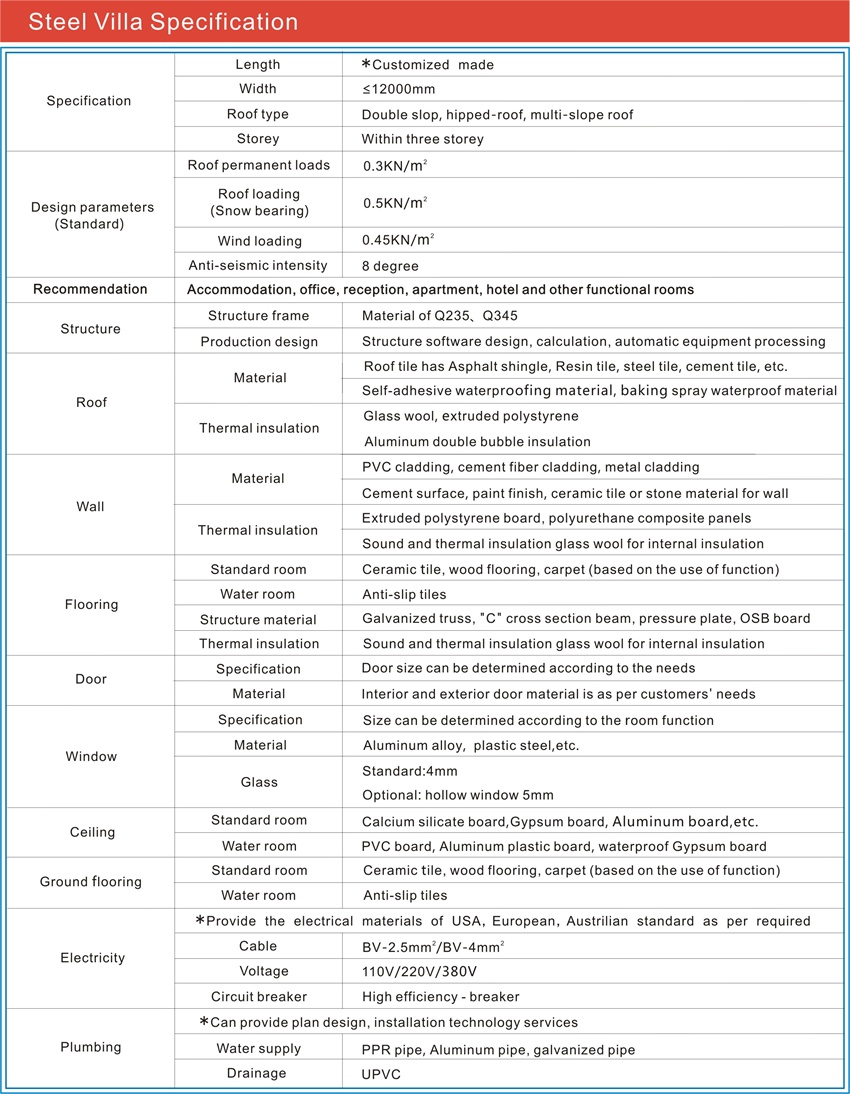 Easy installation----the mounting holes and the pipe holes of light steel villa are prefabrication, 4-5 people can complete the installation.